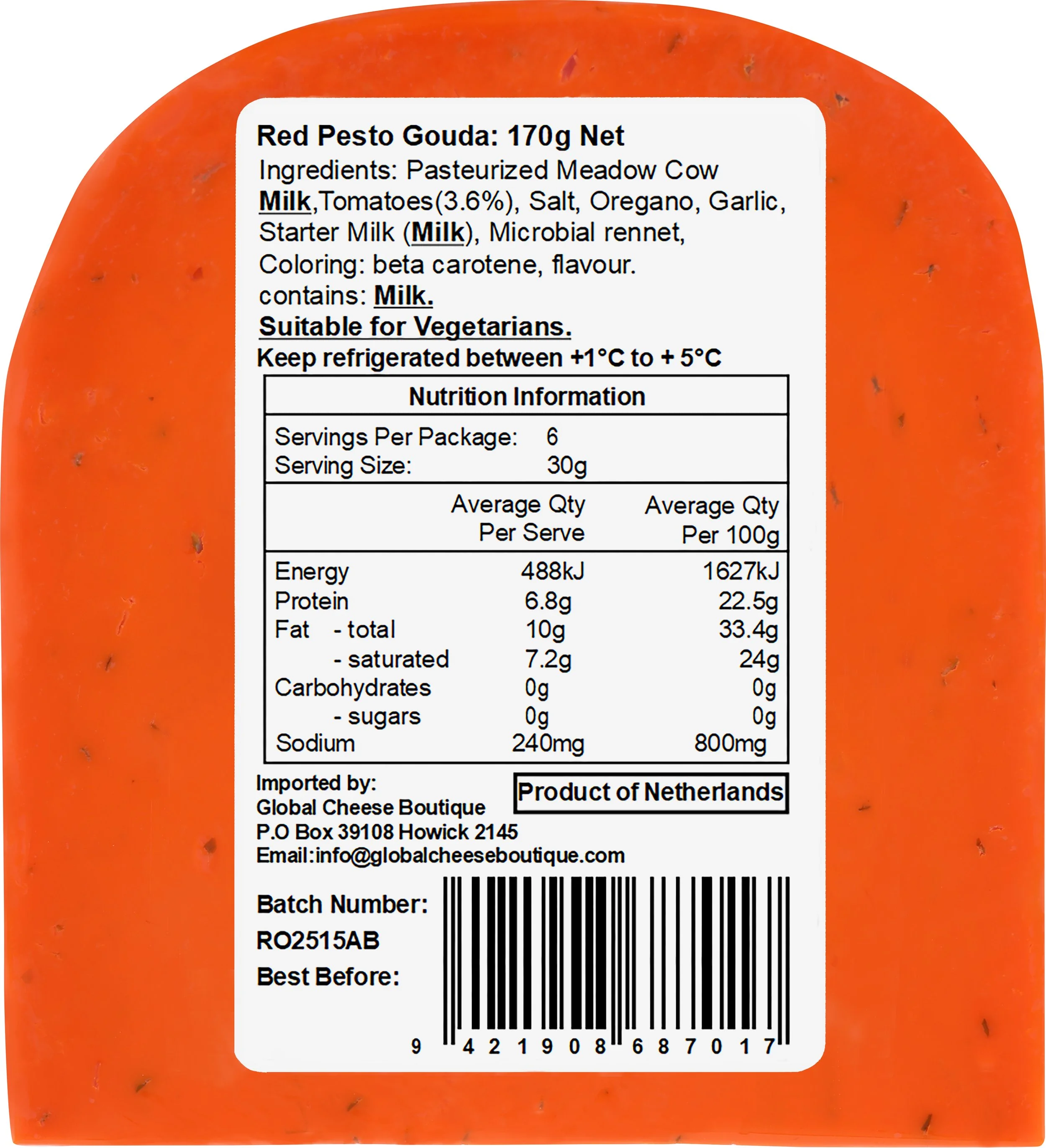 Pasteurised meadow cow milk, salt, sambal mix (1.5%) [tomato granulate, chillies], starter culture (milk), microbial rennet, colouring agent annatto norbixine.